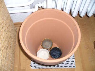 Ein gefaltetes Tuch sorgt für einen Luftspalt unterm Deckel. Der Deckel ist ein Ton-Untersetzer, wie man sie für solche Blumentöpfe bekommt.